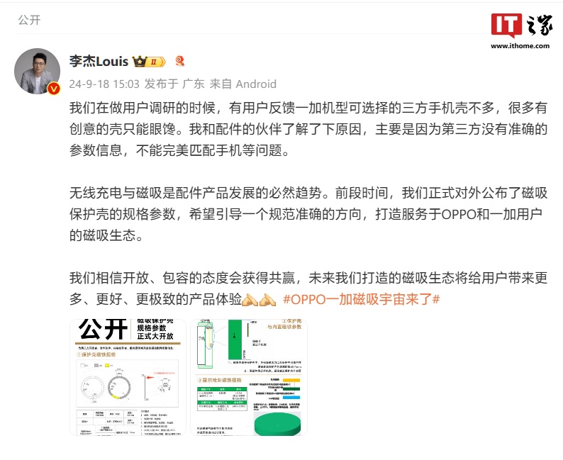 文章来源于互联网:IT之家-一加中国区总裁李杰公布 OPPO / 一加手机磁吸保护壳规格参数,为第三方配件厂商提供标准