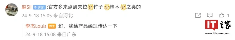 不止于此,李杰还在微博中回应网友期待“多来点凯夫拉、竹子、檀木(材质的手机保护壳)系列”时表示,“好,我给产品经理传达一下。”