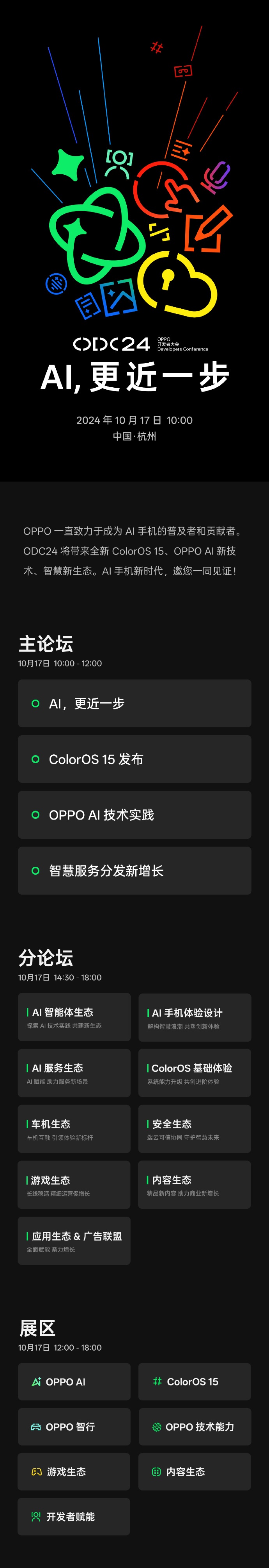 OPPO 开发者大会(ODC)是 OPPO 面向全球开发者发布最新软件和技术的年度科技大会。ODC24 以“AI,更近一步”为主题,围绕 ColorOS 15 新体验、AI 新技术、智慧新生态等议题,分享 AI 手机时代下的 OPPO 战略布局和技术成果。