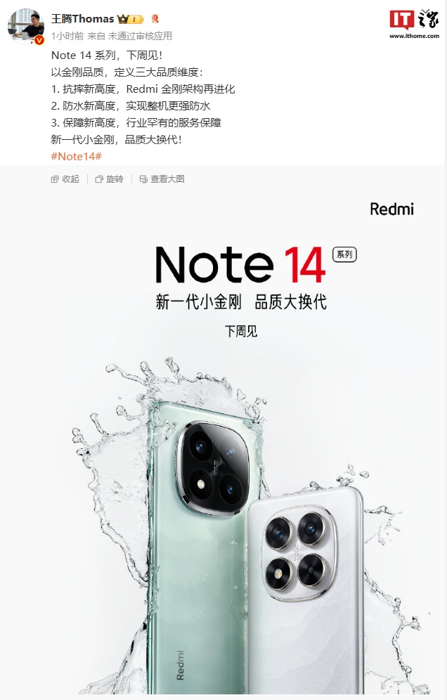 据IT之家今天早些时候报道,王腾已经宣布 Redmi Note 14 系列手机“下周见”,并公布了外观海报公布。抗摔、防水、服务保障将成为新机的三大亮点,海报还展示两种镜头设计,后置镜头及闪光灯呈对称排列,机身背面较为圆润。