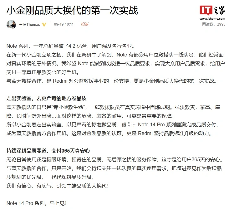 IT之家 9 月 19 日消息,小米中国区市场部副总经理、Redmi 品牌总经理王腾今日宣布,Redmi Note 14 Pro 系列成为蓝天救援官方合作用机。