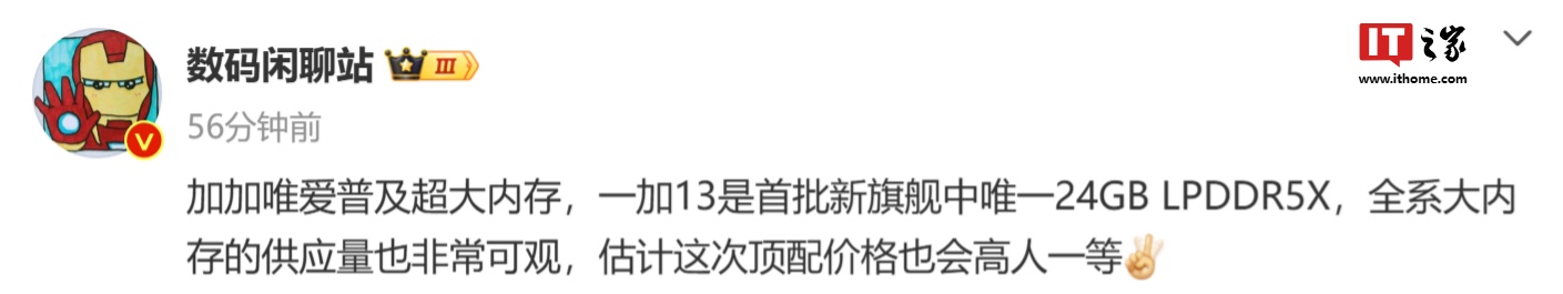 IT之家 9 月 19 日消息,博主 @数码闲聊站 今日透露,一加 13 是首批新旗舰中唯一 24GB LPDDR5X。