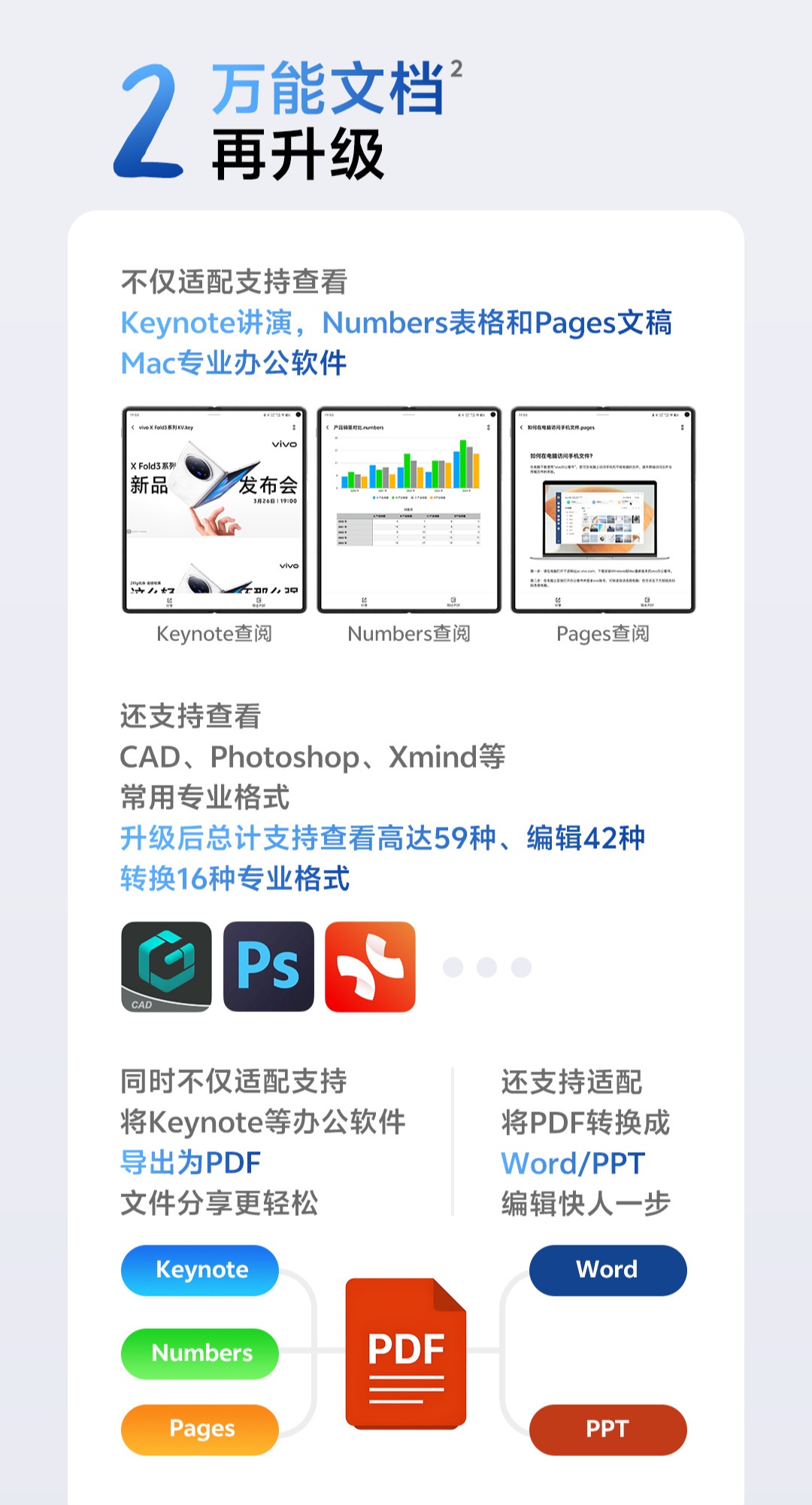 升级后总计支持查看达 59 种、编辑 42 种、转换 16 种专业格式。同时适配将 Keynote 等办公软件导出为 PDF,将 PDF 转换成 Word / PPT。