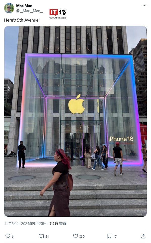 文章来源于互联网:IT之家-苹果 iPhone 16 / Pro 系列线下发售概览:第五大道店上演灯光秀,多地未现排队长龙