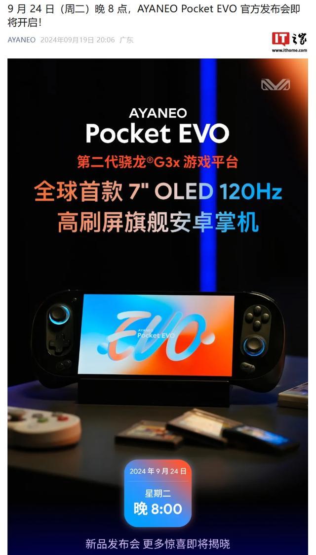 原标题:AYANEO Pocket EVO 安卓掌机 9 月 24 日发布:7 英寸 OLED 高刷屏、第二代骁龙 G3x,预定价 2699 元起