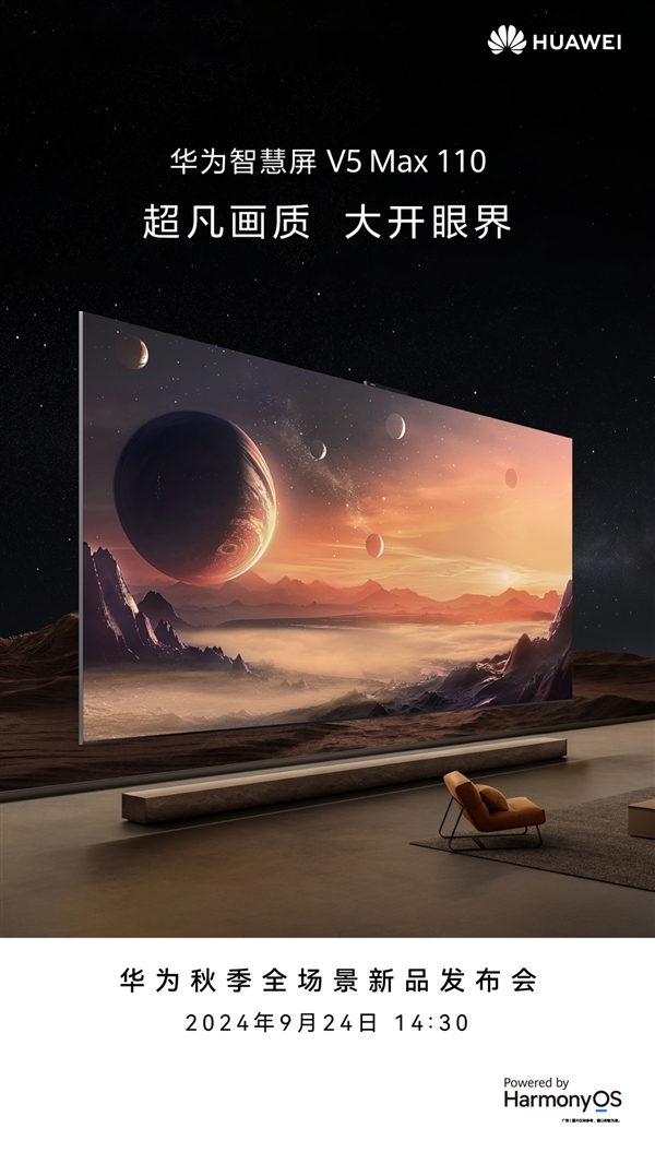 快科技9月20日消息,华为秋季全场景新品发布会将于9月24日14:30召开,官方最新宣布,华为智慧屏V5 Max 110将在此次发布会上亮相。
