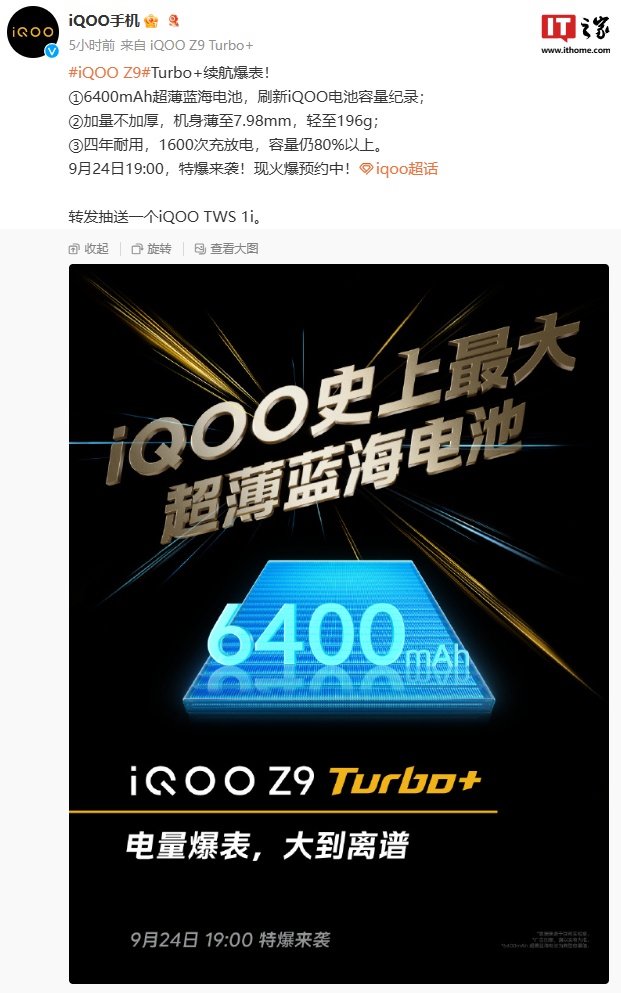 文章来源于互联网:IT之家-iQOO Z9 Turbo+ 手机预热:6400mAh 超薄蓝海电池,9 月 24 日发布