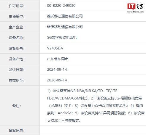 IT之家 9 月 21 日消息,一款型号为 V2405DA 的 vivo 新机于 9 月 14 日在工信部完成入网,支持北斗三号短报文。