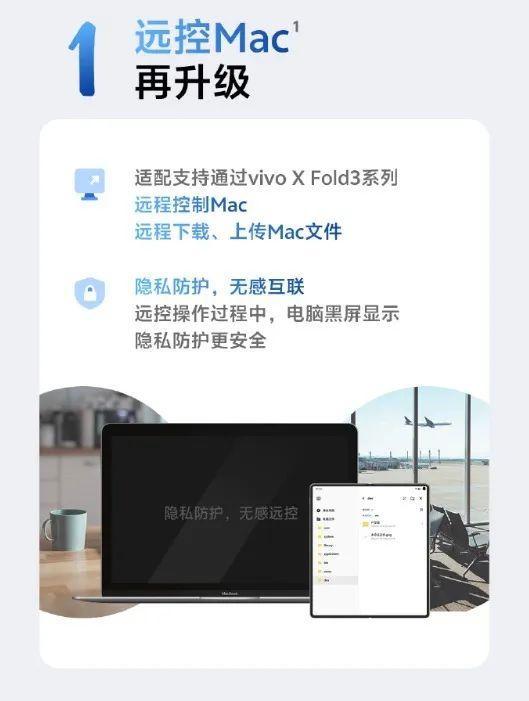 升级后的vivo X Fold3将支持远程控制Mac电脑设备。用户可以通过手机直接进行远程下载和上传文件到Mac电脑。此外,为了加强用户隐私保护,在进行远程控制时,Mac电脑的屏幕会显示为黑屏,防止旁人看到屏幕上的内容,从而保护用户的隐私安全。