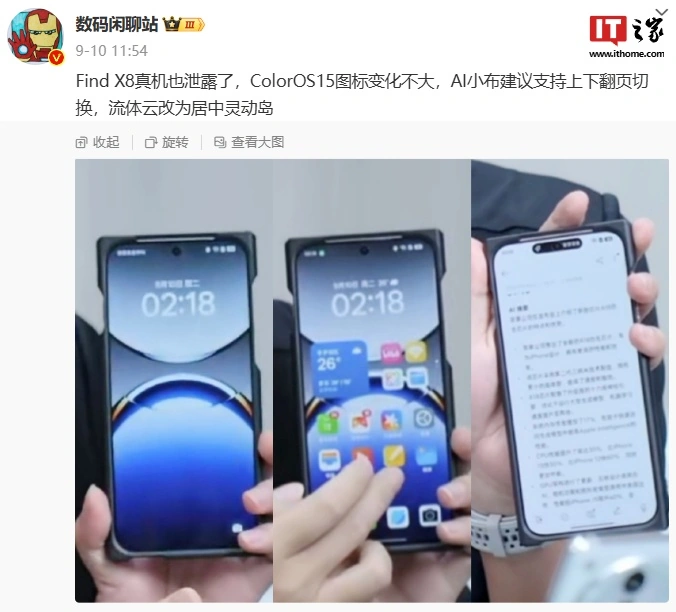 此外,周意保曾在 9 月 9 日的直播中,展示一款带黑色保护壳的新机。博主 @数码闲聊站 称其为 OPPO Find X8。该手机 UI 风格与当前版本的 ColorOS 14 类似,桌面小布建议支持滑动翻页切换。另外,手机前摄区域显示有应用实时活动,博主称“流体云改为居中灵动岛”。