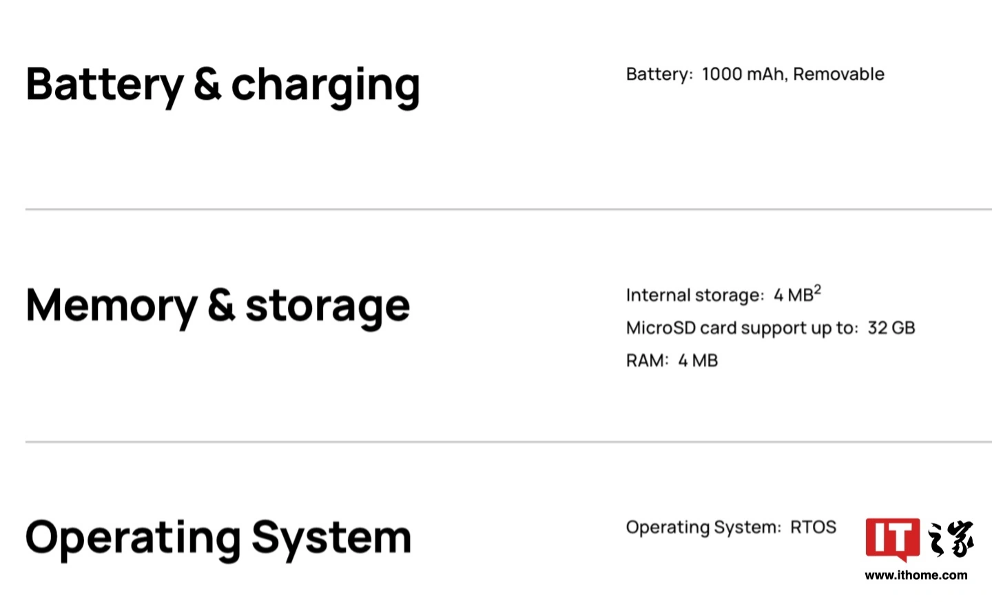 参考 HMD 官网,该机配备 4MB 存储空间,内置 1000 毫安时电池,使用 Micro-USB 接口,搭载“RTOS”。