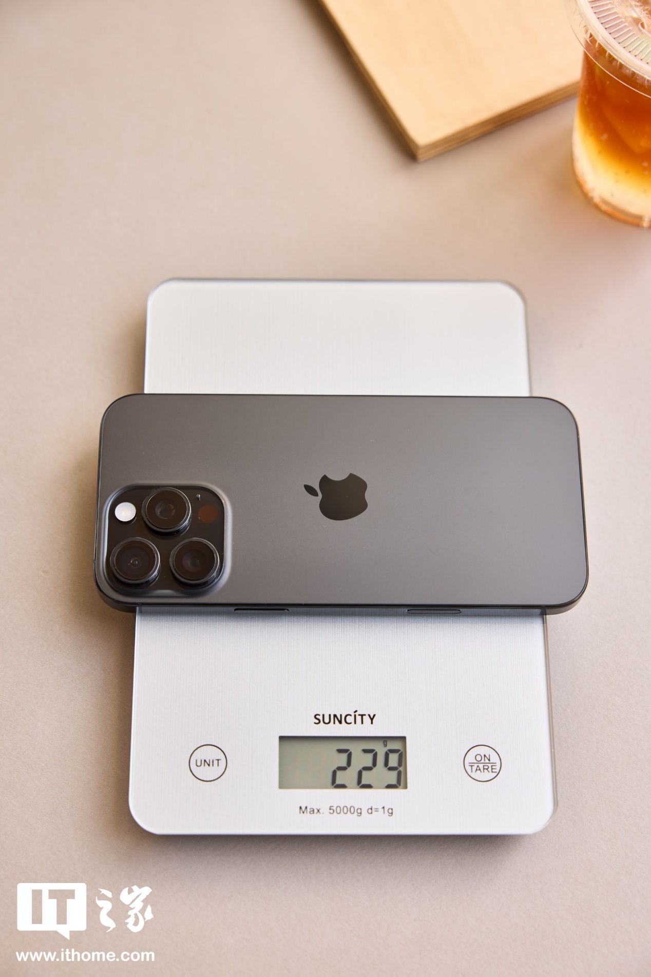 iPhone 16 Pro 重量由前代的 187g 增长至 199g,Pro Max 也从前代的 221g 增加到了 227g(实测 229g),实测厚度为 8.2mm。