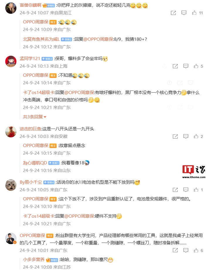 从图中可以看到,屏显第一位是 1,新机重量有望控制在 200g 以内。另外,有网友在评论区提问“一八开头还是一九开头”得到了周意保回复“故意留点悬念”。
