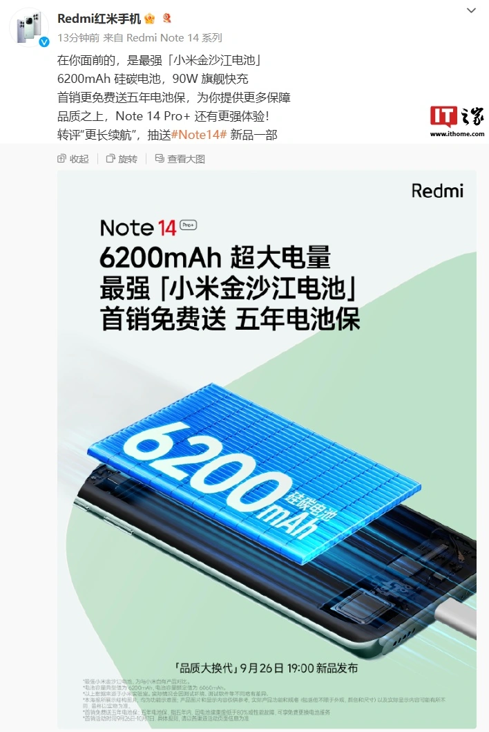 IT之家 9 月 24 日消息,小米今日发文宣布,小米 Redmi Note 14 Pro+ 手机配备 6200mAh 硅碳电池,号称“最强小米金沙江电池”,同时支持 90W 快充,首销免费送五年电池保。