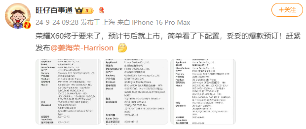 9 月 24 日,数码博主 @旺仔百事通 在微博爆料了关于荣耀 X60 手机的新消息。表示,“荣耀 X60 终于要来了,预计节后就上市,简单看了下配置,妥妥的爆款预订。”