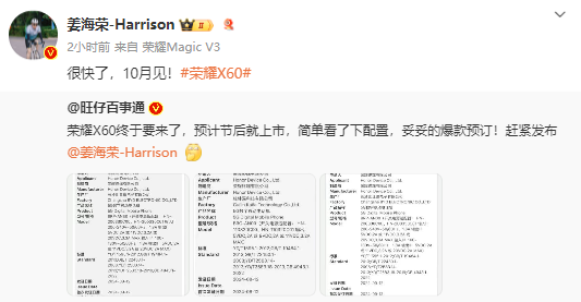 这次,在数码博主爆料后,他随后立即转发微博表示:“很快了,10 月见!”由此可见,荣耀 X60 系列距离发布或许确实不用等太久,国庆节之后这个时间点还是比较靠谱的。