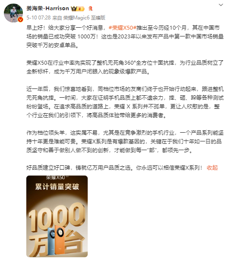 荣耀 X50 推出历经 10 个月,就在中国市场的销量成功突破 1000 万,这是 2023 年以来发布产品中第一款中国市场销量突破千万的安卓单品。