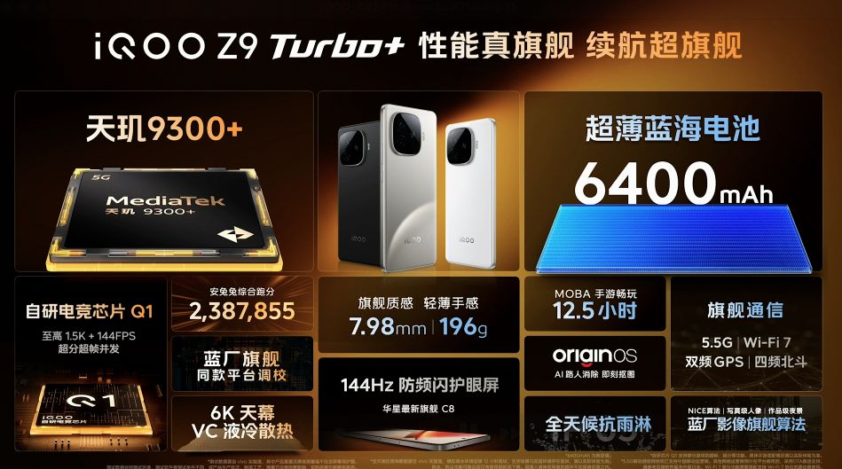 这款手机搭载天玑 9300+ 处理器,内置 Q1 电竞芯片,支持多款游戏影音应用超分超帧;搭载索尼光喻 LYT-600 主摄,内置 NICE 影像算法;机内配备 6400mAh 超薄蓝海电池(支持 80W 快速充电及反向充电),号称“四年耐用,1600 次充放电,容量仍 80% 以上”。