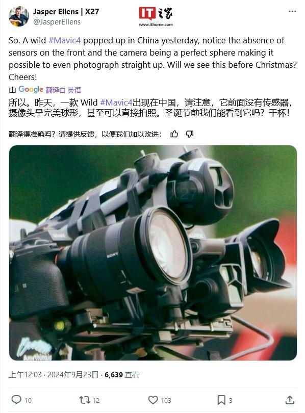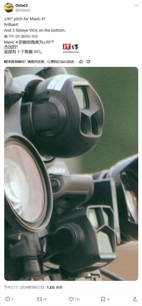 消息源 Jasper Ellens、OsitaLV 和 Igor Bogdanov 纷纷转发了这张图片,并表示这个神秘拍摄设备就是大疆 Mavic 4 Pro。IT之家附上相关图片如下: