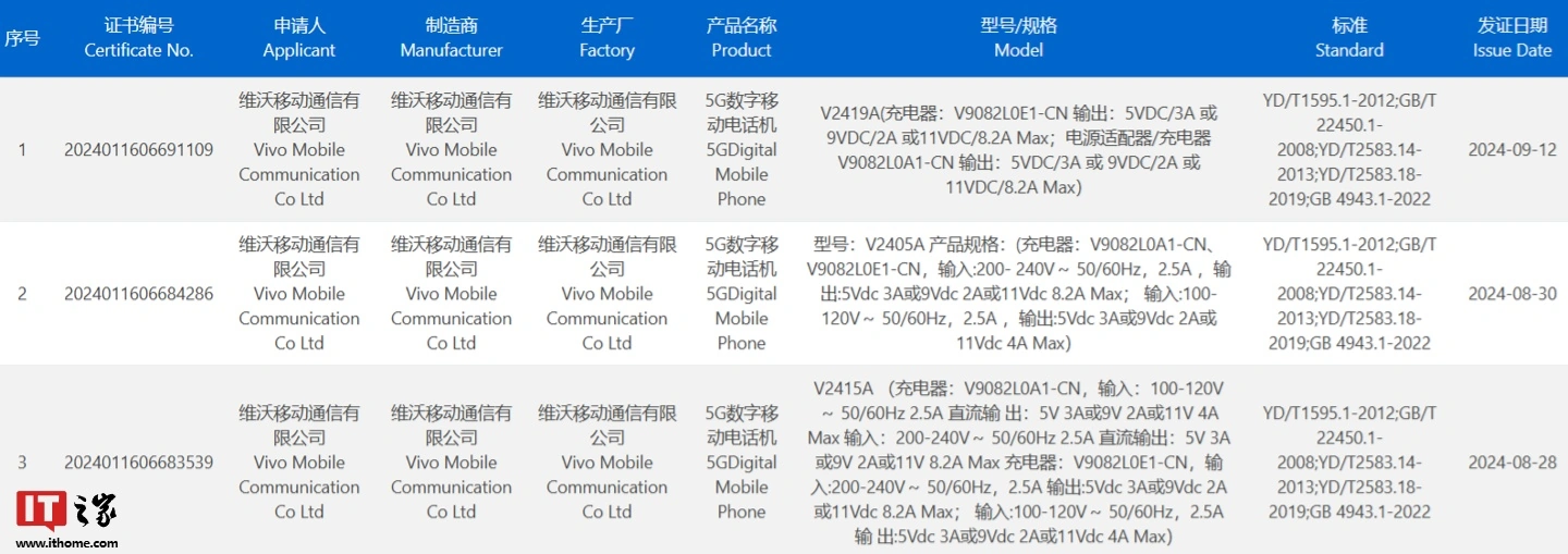 IT之家此前报道,vivo X200 手机已三证齐全,型号为 V2415A、V2405A、V2419A 的三款 vivo 新机已于 8 月 28 日、8 月 30 日、9 月 12 日陆续通过 3C 认证,均支持 90W 快充。