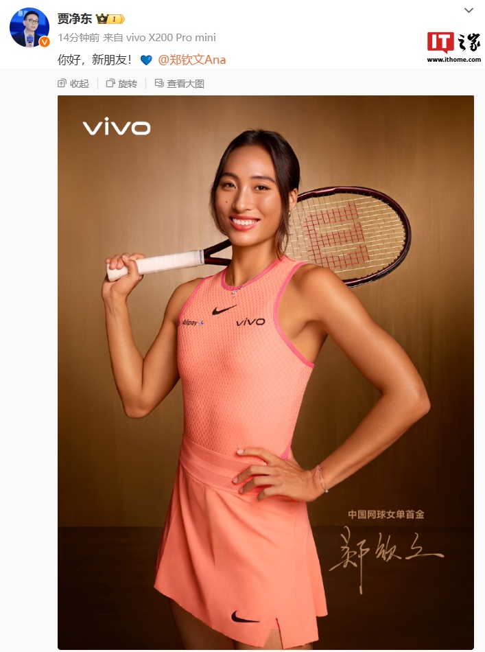 IT之家 9 月 25 日消息,vivo 品牌副总裁、品牌与产品战略总经理贾净东今日发文宣布“新朋友”中国网球女单首金郑钦文。微博机型小尾巴显示“vivo X200 Pro mini”。