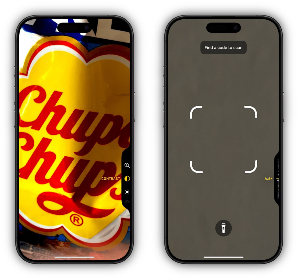 至于放大镜功能,相机控制在许多场景中也会发挥重要作用。对于视力受损的人来说,该功能可以即时放大菜单、产品标签或药品说明上的小字,无需在应用中费力寻找。此外,相机控制在放大镜工具中保留了变焦调节功能,并且增加了菜单选项,包括亮度、对比度、滤镜、手电筒等,前提是你在放大镜的设置菜单中添加了这些选项。