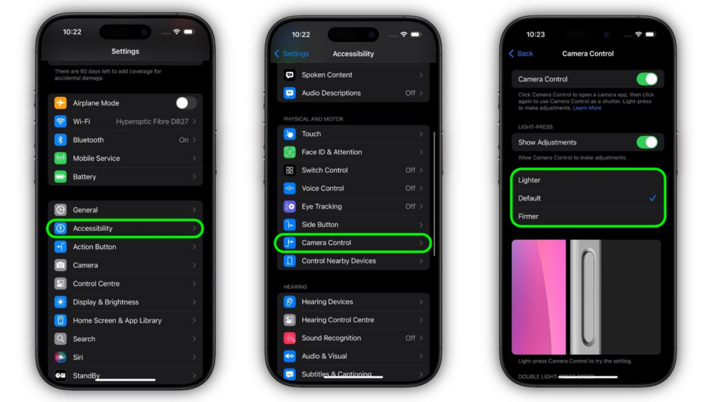 如果你觉得轻按功能难以触发,或者按钮对你的按压力度过于敏感,可以根据个人需要调整相机控制按钮的灵敏度。以下是调整步骤: