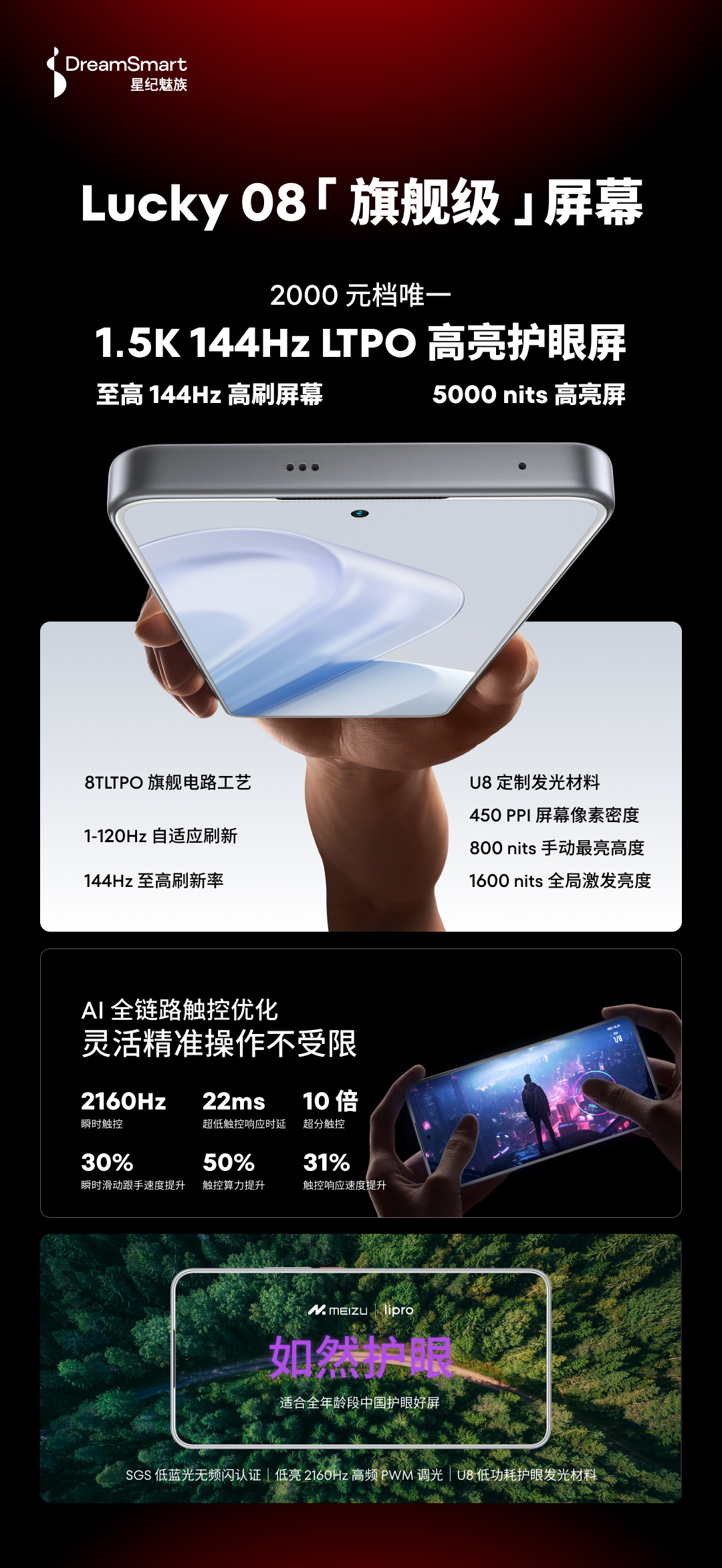 屏幕方面,官方称魅族 Lucky 08 拥有 2000 元档唯一 1.5K 144Hz LTPO 高亮护眼屏,搭配 AI 全链路触控优化及湿手触控优化。这是一块 6.78 英寸 OLED 屏幕,采用天马 U8 发光材料,支持 144Hz 刷新率(1-120Hz 自适应),全屏激发亮度 1600nit,局部峰值亮度 5000nit,低亮度 2160Hz 高频 PWM 调光。
