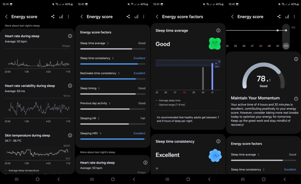 虽然睡眠数据会影响整体能量评分,但睡眠追踪的表现值得单独详细说明。您还会在 Samsung Health 中看到基于 Galaxy Ring 数据的单独睡眠评分。三星在其智能手表上对睡眠追踪的工作相当出色,而在 Galaxy Ring 中又更进一步,引入了夜间活动和睡眠潜伏期等新指标,旨在帮助您改善睡眠质量。