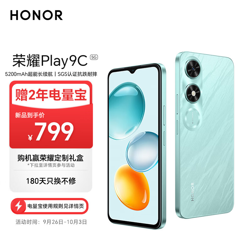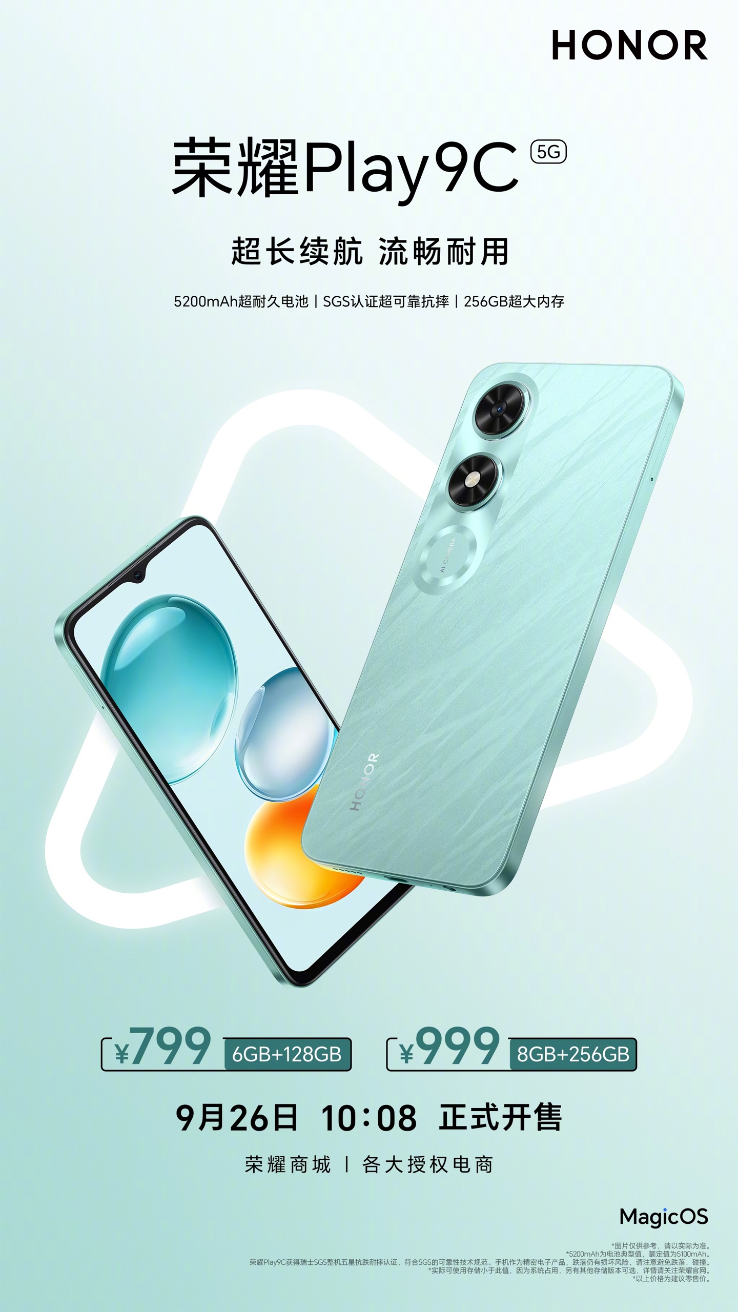 IT之家 9 月 26 日消息,荣耀官方宣布荣耀 Play 9C 手机今日开启首销,搭载联发科天玑 6100+ 处理器、5200mAh 电池,6+128GB 版本 799 元,8+256GB 版本 999 元。