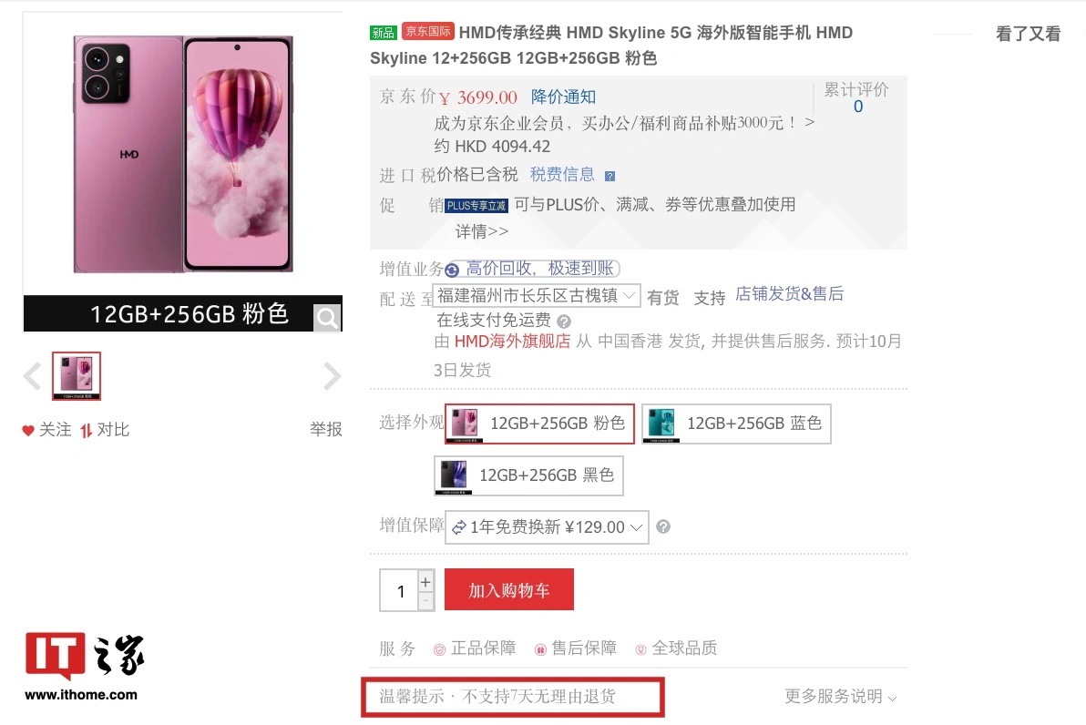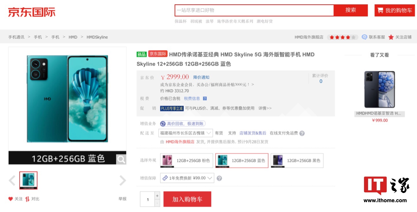 文章来源于互联网:IT之家-京东国际在售 HMD Skyline 手机涨价 700 元:骁龙 7s Gen 2 + 12G + 256G 现售 3699 元