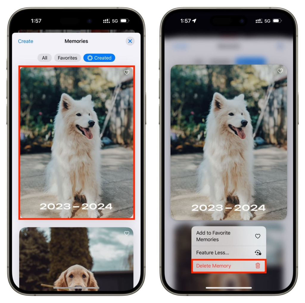 若要刪除 Apple Intelligence 創建的回憶,只需長按回憶並選擇「刪除回憶」。但請注意,刪除回憶影片並不會刪除其中包含的相片和影片。