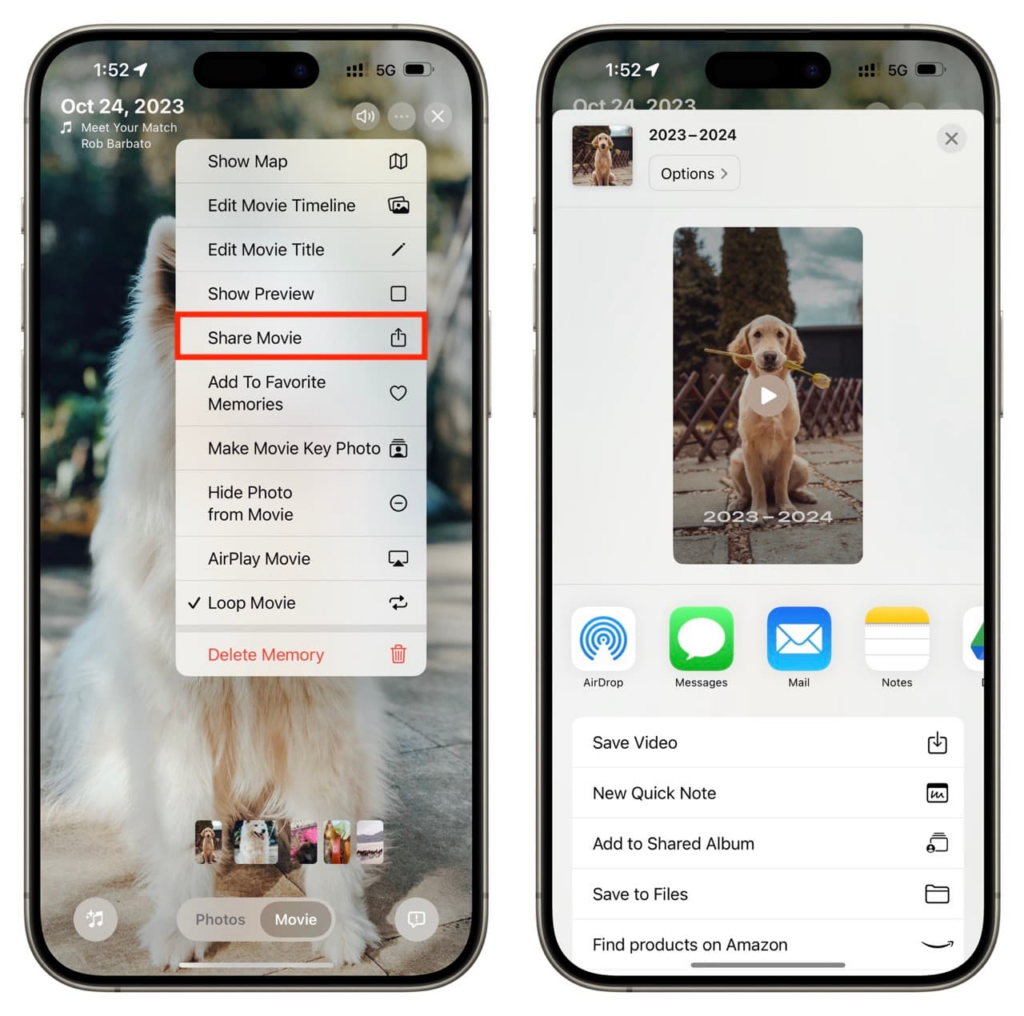 你還可以點擊回憶影片右上角的三點圖示,選擇「分享影片」,將其保存到「相片」應用程式或「檔案」應用程式中。