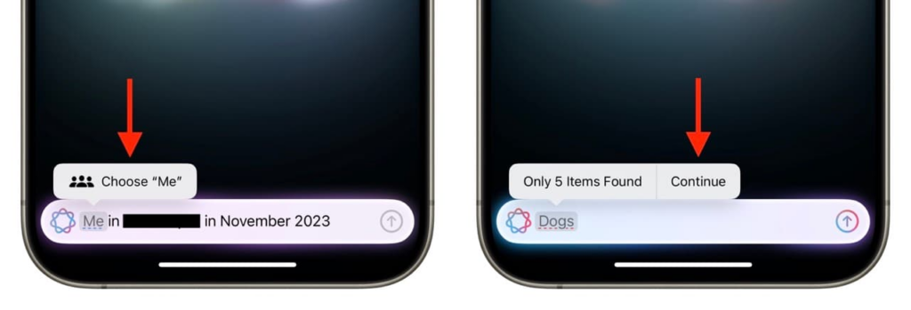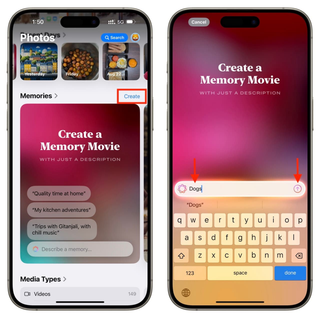3、描述你的回憶。你可以簡單輸入一個詞彙,例如「狗」,系統便會挑選出包含狗的照片來創建回憶;或者可以更具體一些,像是「2024 年 7 月我在巴黎的照片」。輸入後點擊鍵盤上的「完成」或點擊箭頭按鈕。