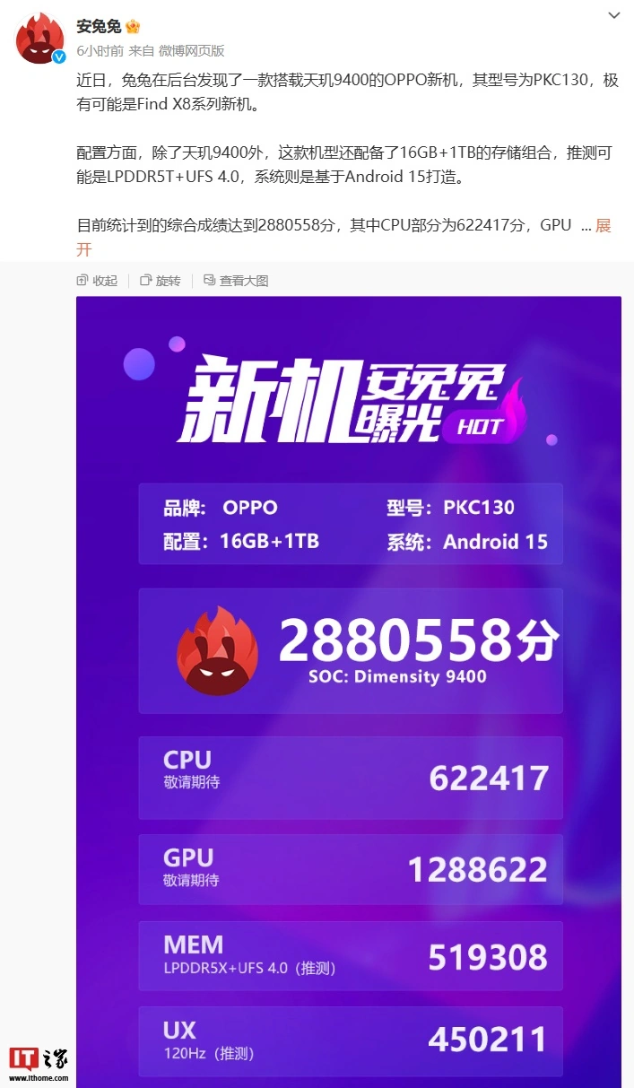 文章来源于互联网:IT之家-OPPO“PKC130”新机现身安兔兔:超 288 万分、16GB+1TB 存储组合,预计为 Find X8 Pro 卫星通信版