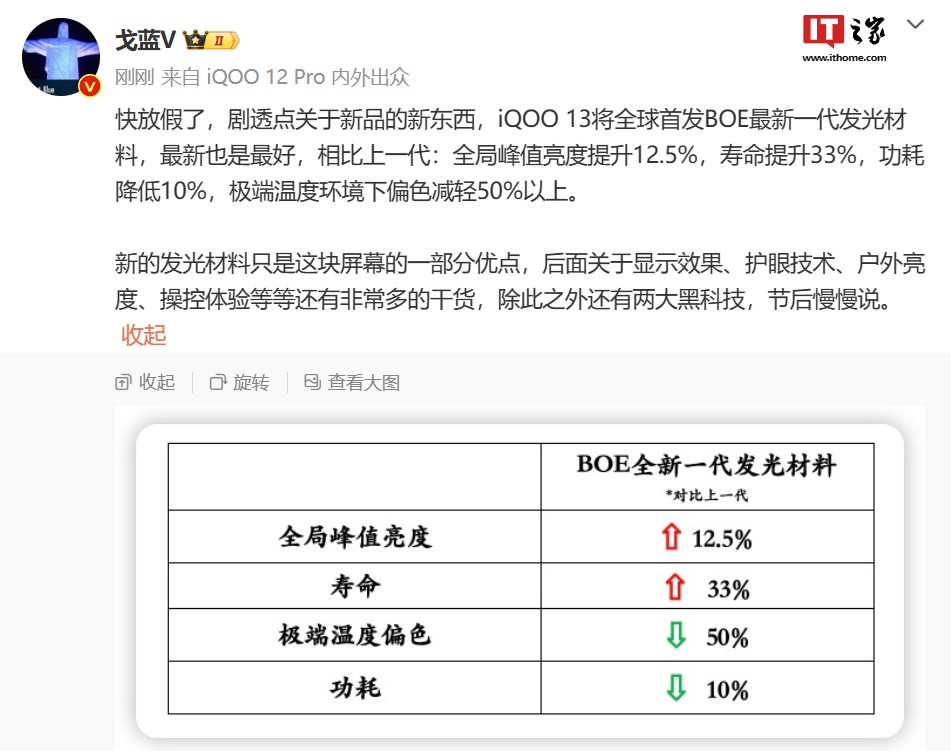 IT之家 9 月 27 日消息,iQOO 产品经理 @戈蓝V 今日在微博透露,iQOO 13 将全球首发 BOE(京东方)最新一代发光材料。