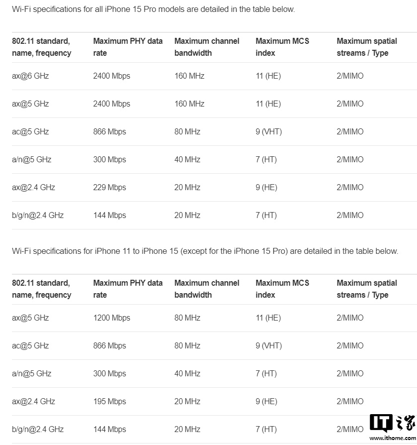 IT之家注:上述规格基于美版 iPhone,苹果的 Wi-Fi 6E 在中国大陆不可用,Wi -Fi 7 虽在中国大陆可用但不支持 6 GHz 频段。