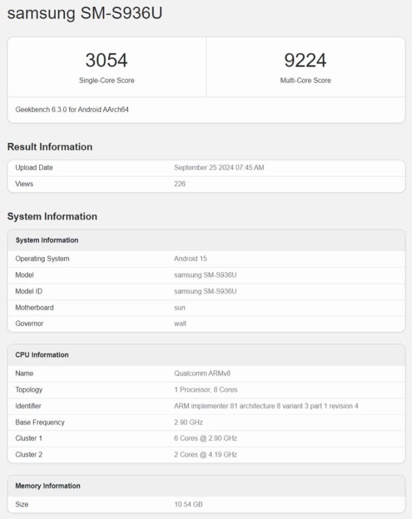 IT之家 9 月 27 日消息,科技媒体 sammyguru 今天(9 月 27 日)发布博文,报道称三星 Galaxy S25 Plus 手机现身 GeekBench 跑分库,搭载高通骁龙 8 Gen 4(有消息称可能叫做骁龙 Elite)芯片,6.3.0 版本单核成绩为 3054 分,多核成绩为 9224 分。