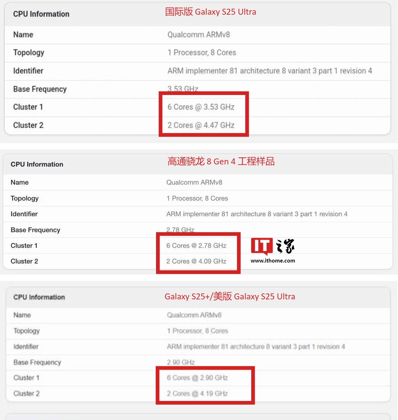 | 骁龙 8 Gen 4 工程样品 | Galaxy S25+/美版 S25 Ultra | 国际版 Galaxy S25 Ultra | |