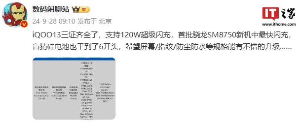 IT之家 9 月 28 日消息,一款型号为 V2408A 的 vivo 新机于 9 月 27 日通过国内 3C 认证,支持 120W 快充。博主 @数码闲聊站 透露该机为 iQOO 13,“首批骁龙 SM8750(正式命名预计为骁龙 8 Gen4 或骁龙 8 Elite)新机中最快闪充”。
