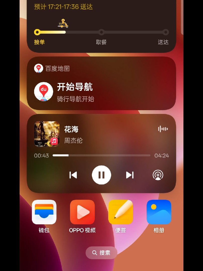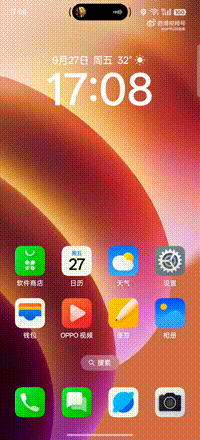 可以看到,流体云位置改为居中,目前已经集合了美团外卖、百度地图、音乐播放等界面。此前有爆料称,ColorOS 15 居中“灵动岛”有两套快捷操作逻辑,支持更多信息显示和点按操作逻辑,同时兼容第三方 App。