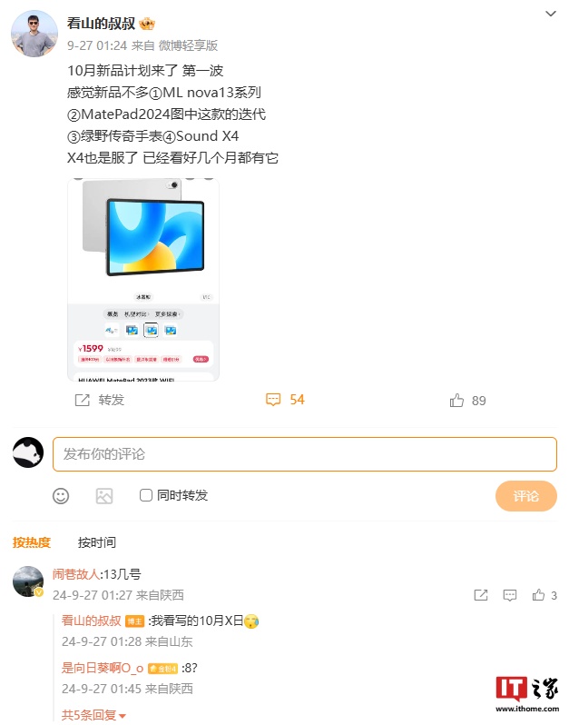 IT之家 9 月 29 日消息,博主 @看山的叔叔 发文爆料,华为 10 月新品计划“第一波”含 nova13 系列手机、MatePad 2024 平板迭代款等,详情如下: