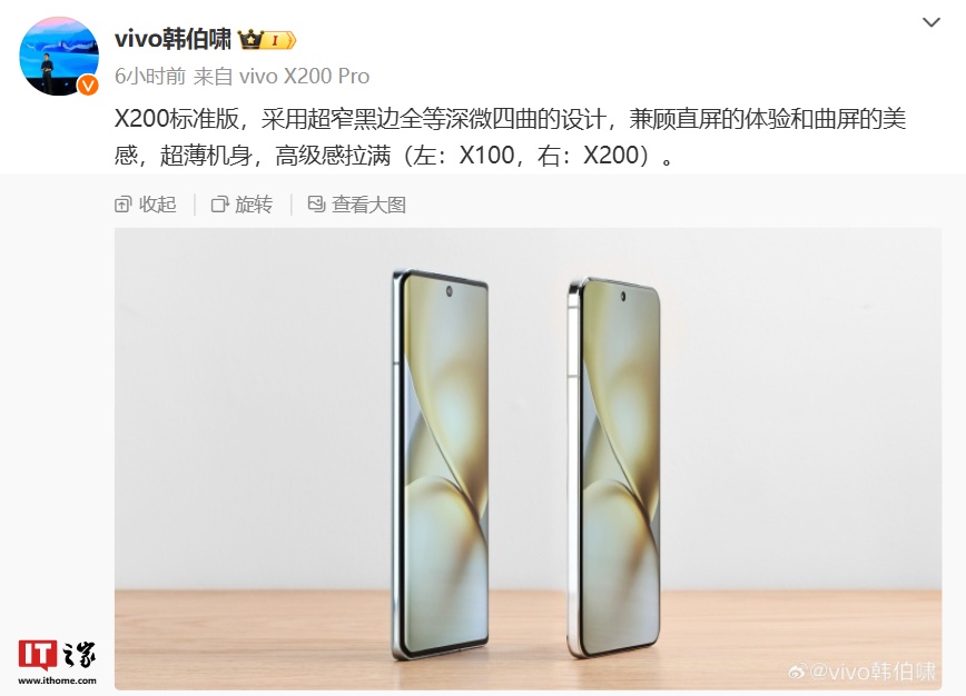 IT之家 9 月 29 日消息,vivo 产品经理韩伯啸今日在微博分享了 X200 标准版手机正面照,新机采用超窄黑边全等深微四曲的设计,据称“兼顾直屏的体验和曲屏的美感”“可能是手感最佳”。