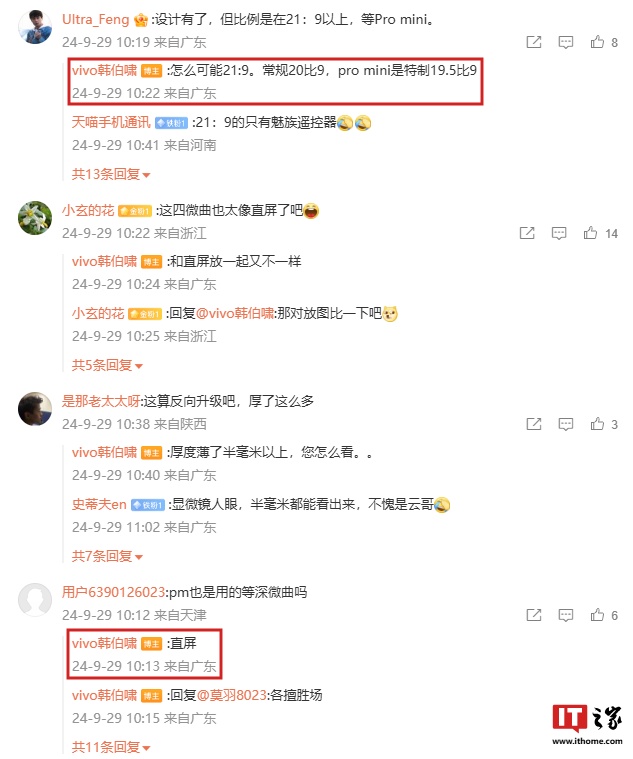 IT之家注意到,韩伯啸在微博评论区中向用户透露了 vivo X200 Pro mini 手机的屏幕信息:该机将使用直屏,其比例是“特制 19.5:9”。