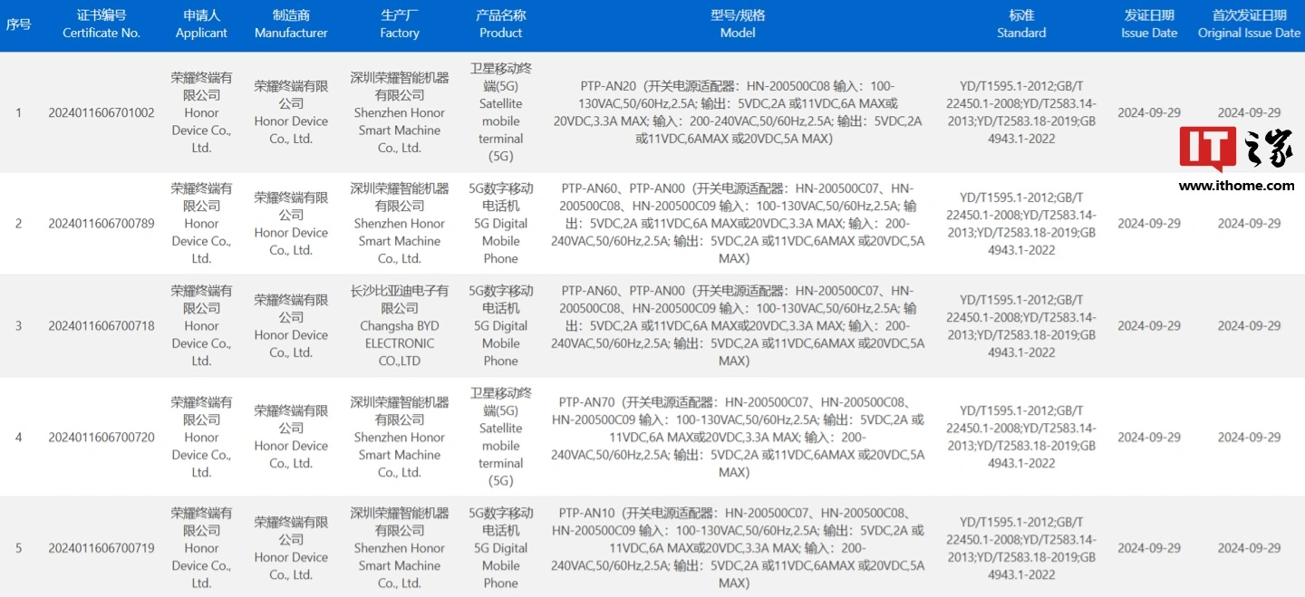 IT之家 9 月 30 日消息,型号分别为 PTP-AN20、PTP-AN60、PTP-AN00、PTP-AN70、PTP-AN10 五款新机于 9 月 29 日通过了 3C 认证,据博主 @完美编排数码 透露以上新机为荣耀 Magic7 系列。