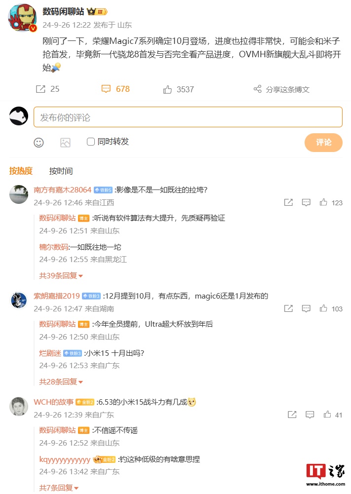 目前尚不知晓此次拍摄设备的具体情况,但据此前报道,荣耀 Magic7 系列手机有望今年 10 月登场,“可能”抢新一代骁龙 8 芯片首发。有网友针对荣耀新机影像水平提出疑问,博主 @数码闲聊站 称“听说有软件算法有大提升”。