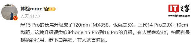 IT之家 9 月 30 日消息,据博主 @体验more 爆料,小米 15 Pro 手机长焦镜头升级为 120mm 索尼 IMX858(5X),而上代小米 14 Pro 则是 3X+10cm 微距。