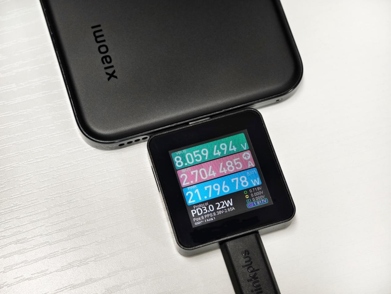 在小米 14 充电测试中,触发 PD3.0 22W 充电协议,充电功率为 8V2.7A 21W,充电一段时间后,充电功率下降至 15W。