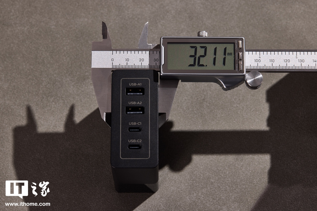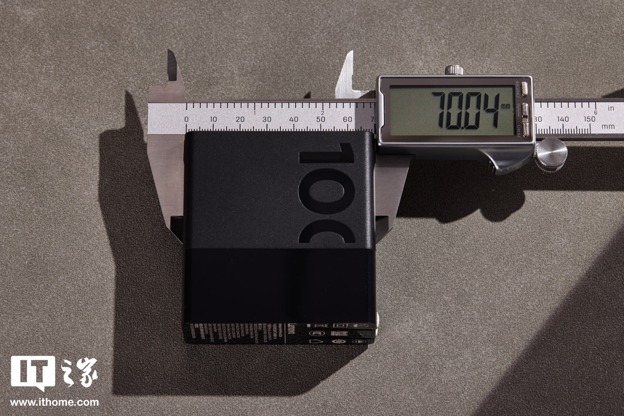 尺寸方面,联想 thinkplus 光影氮化镓 100W 多口充电器的官方数据是 70*73*31mm,IT之家通过游标卡尺对其三围进行实际测量,为 70*72.9*32.1mm。