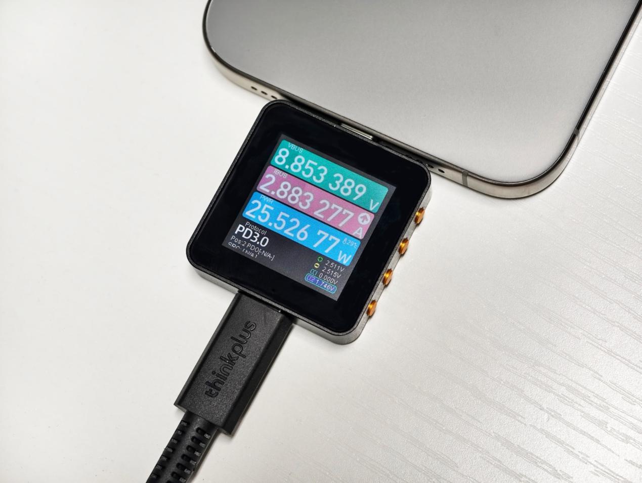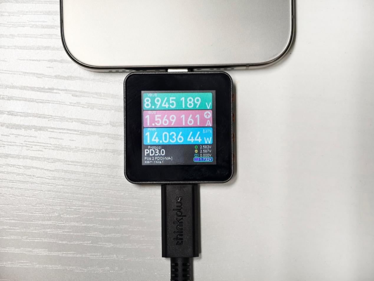 首先,在 iPhone 15 Pro Max 的充电测试中,thinkplus 光影氮化镓 100W 多口充电器触发 PD 3.0 27W 充电协议,充电功率为 8.8V 2.8A 25.5W,开启 PD 快速充电模式。充电一段时间后,充电功率下降至 18W。最终会因 iPhone 电池升温,导致充电功率下降至 10W 以内。